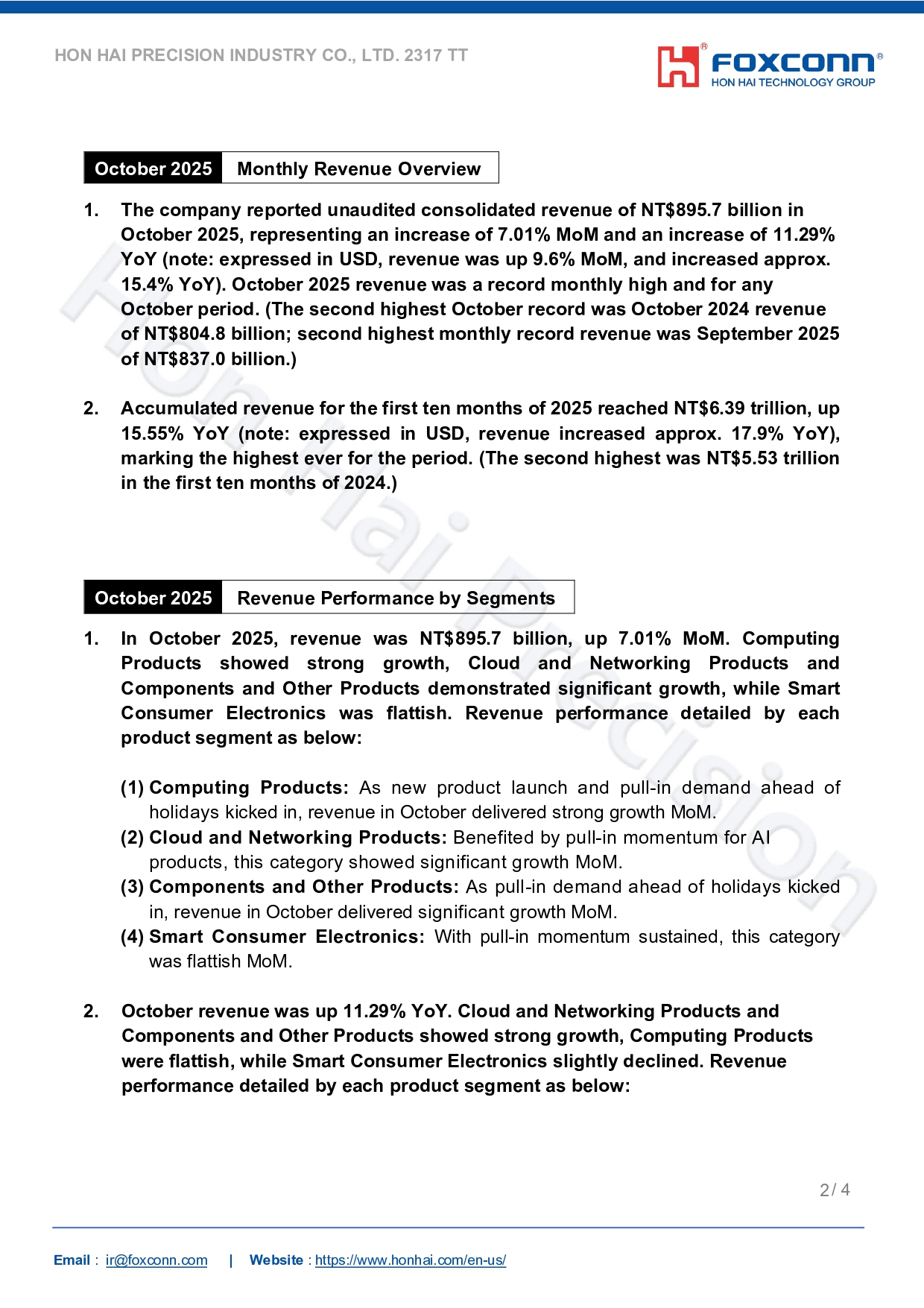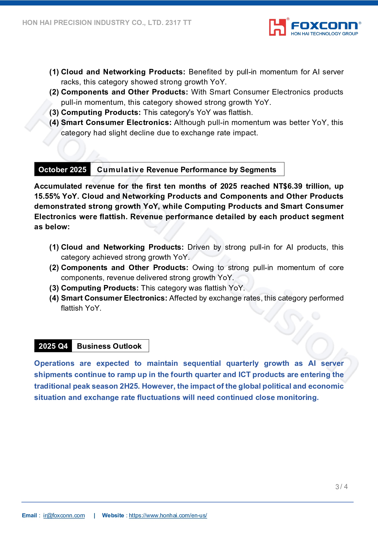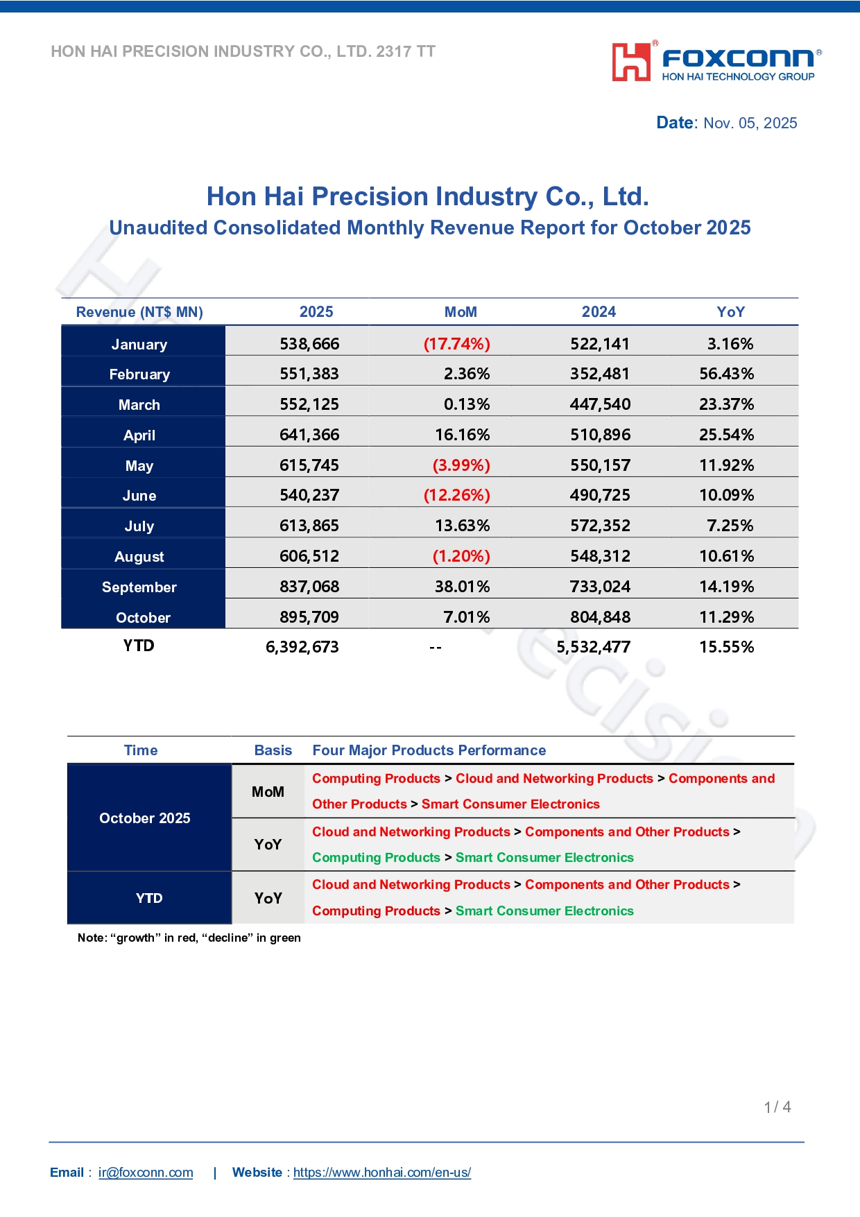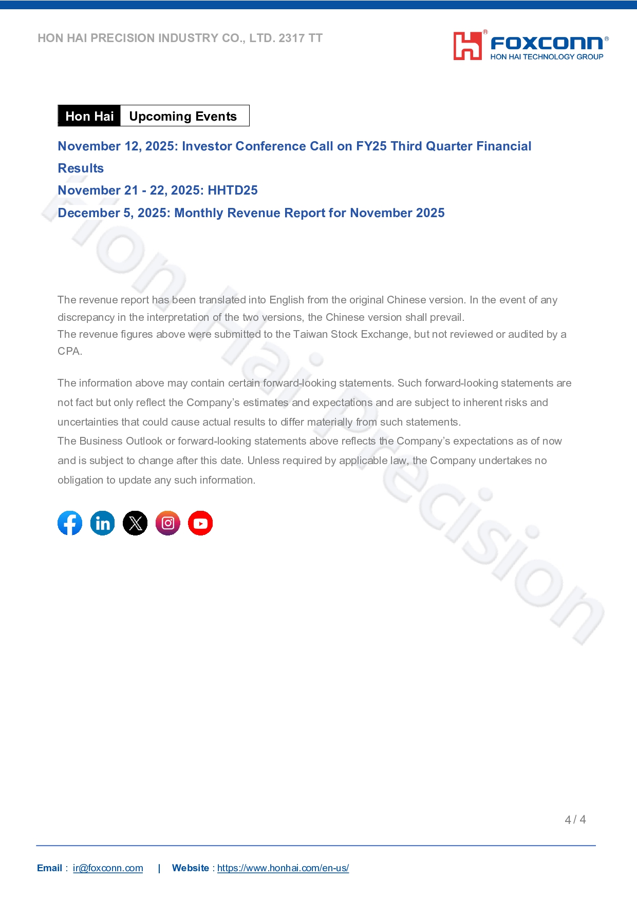 Hon Hai Precision Industry Co., Ltd. announced unaudited consolidated revenue for October 2025