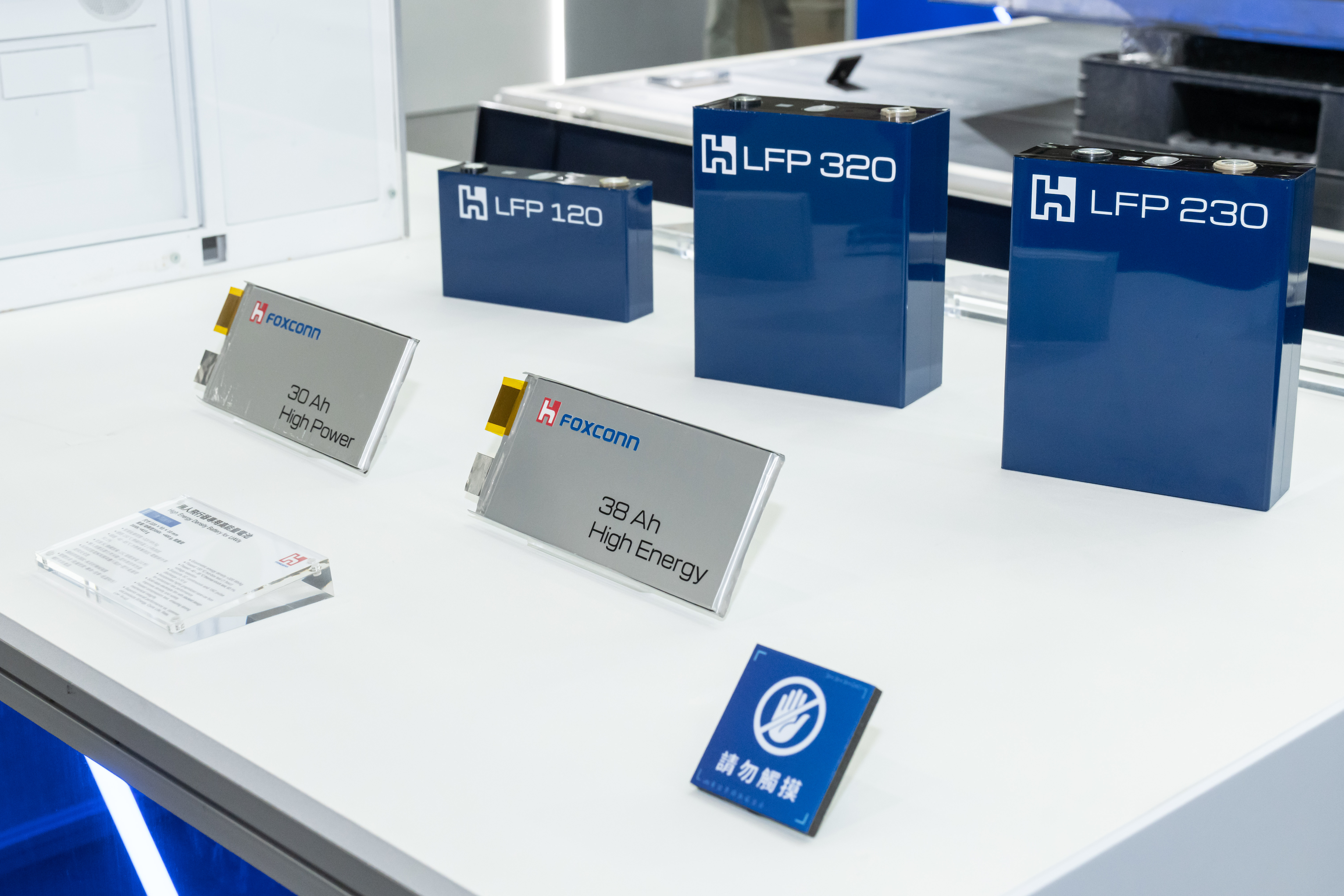在電池產品部分,今年車用電子展鴻海首次對外揭露,位於高雄和發電池中心已量產的自動化生產線。同時端出涵蓋電芯、電池包與電源管理系統(BMS)的垂直整合能力,現場展品包括230Ah LFP電動巴士及商用車電芯、320Ah LFP儲能標準電芯、120Ah LFP快充電芯,以及商用車電池包、E-Bus電池包與5MWh儲能集裝箱系統等。其中,LFP疊片工藝,具備高安全性、高容量密度與低阻抗特性,應用場域橫跨儲能系統、電動巴士、商用車、乘用車及無人飛行器等,展現多元應用佈局。